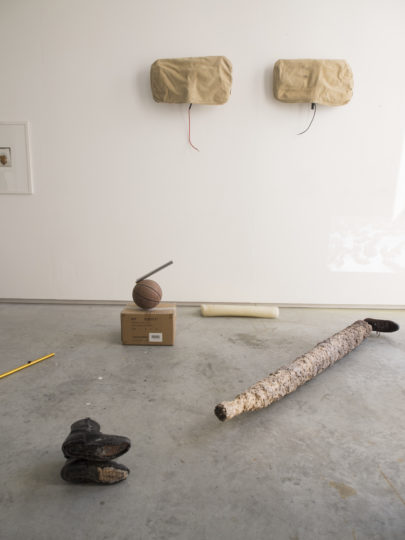 tronc d'arbre rejeté par le fleuve, tige en métal, chaussure, escalier en plastique, fourrure animale