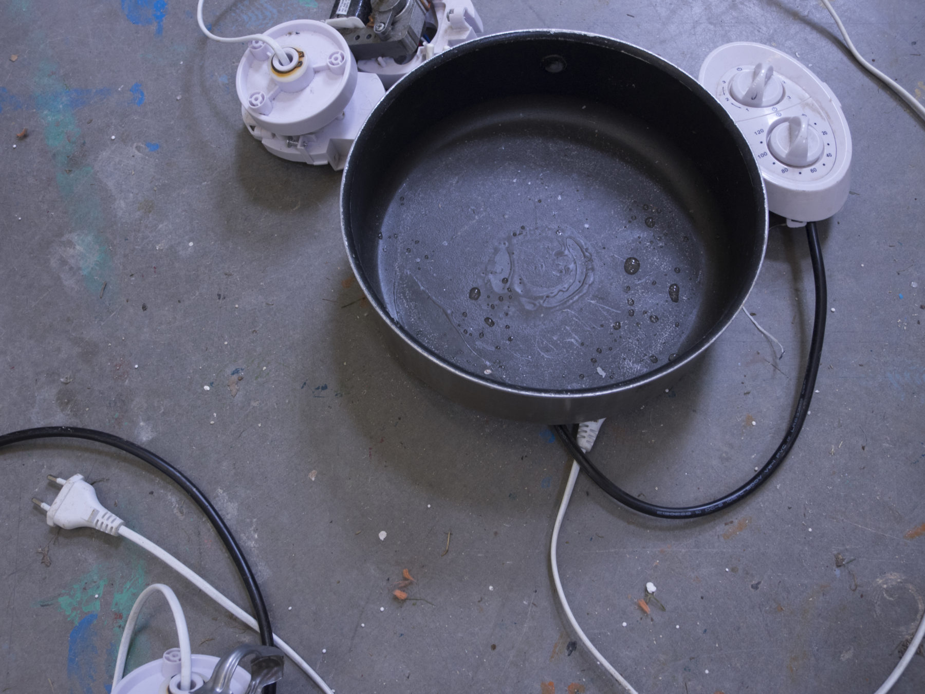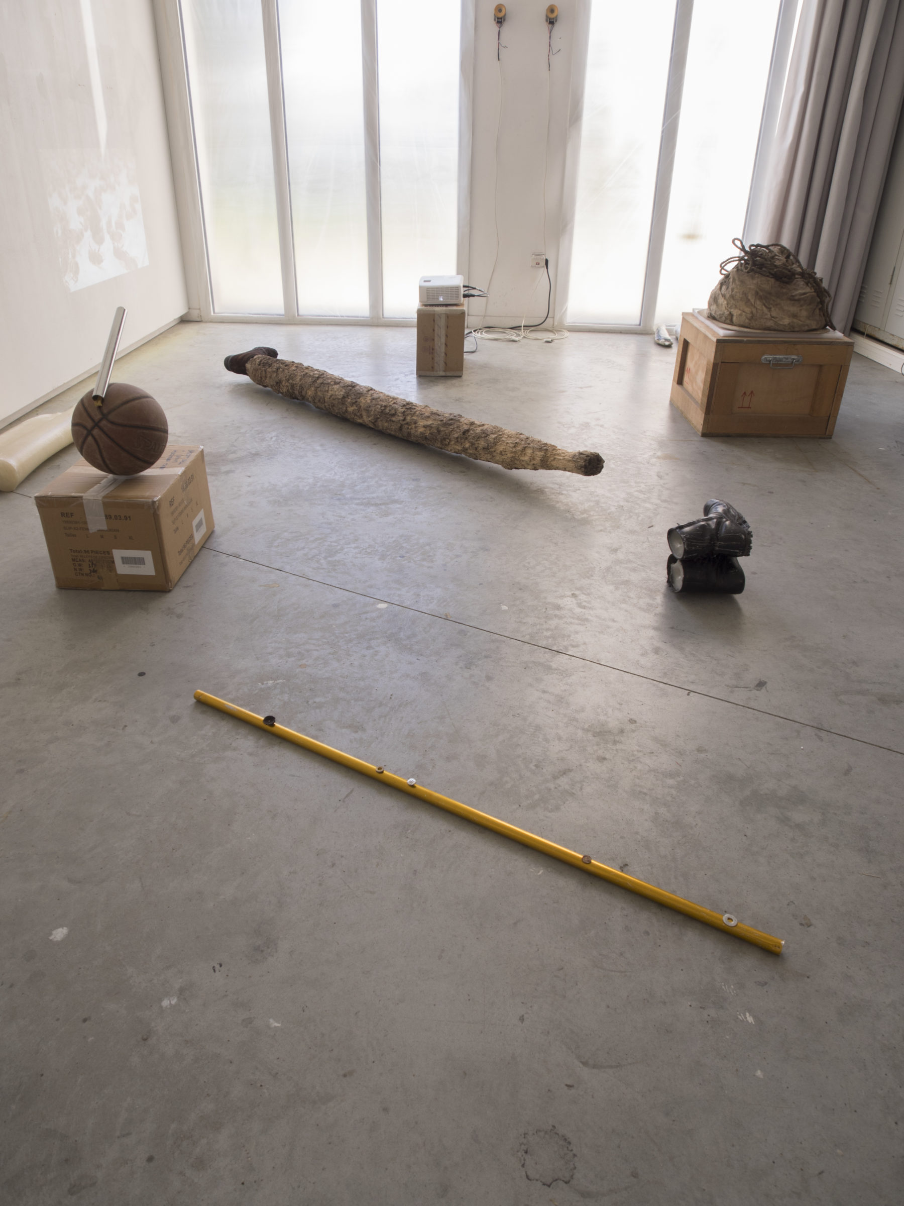 tronc d'arbre rejeté par le fleuve, tige en métal, chaussure, escalier en plastique, fourrure animale