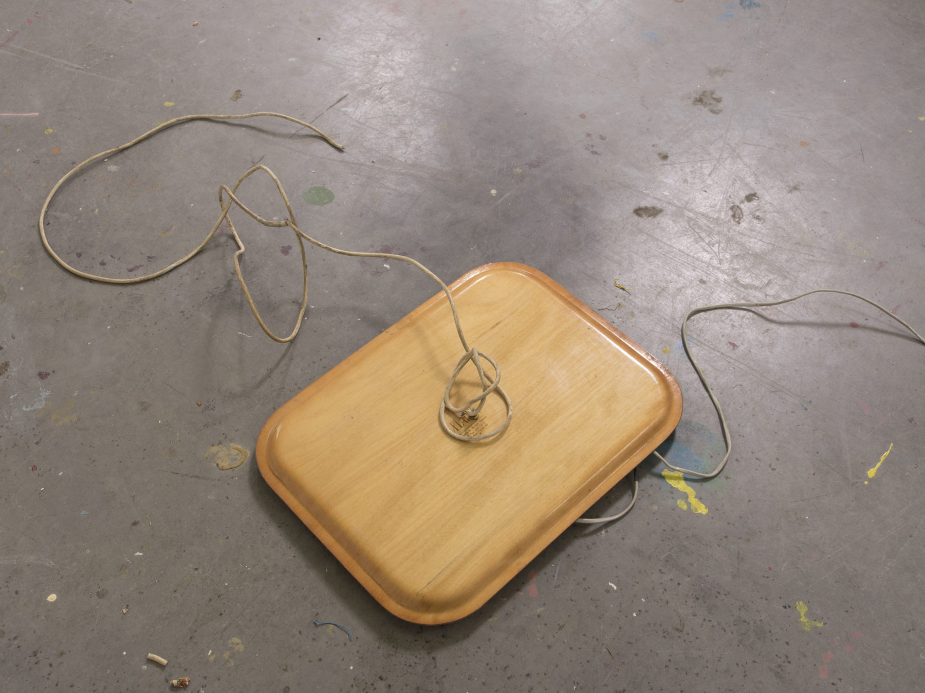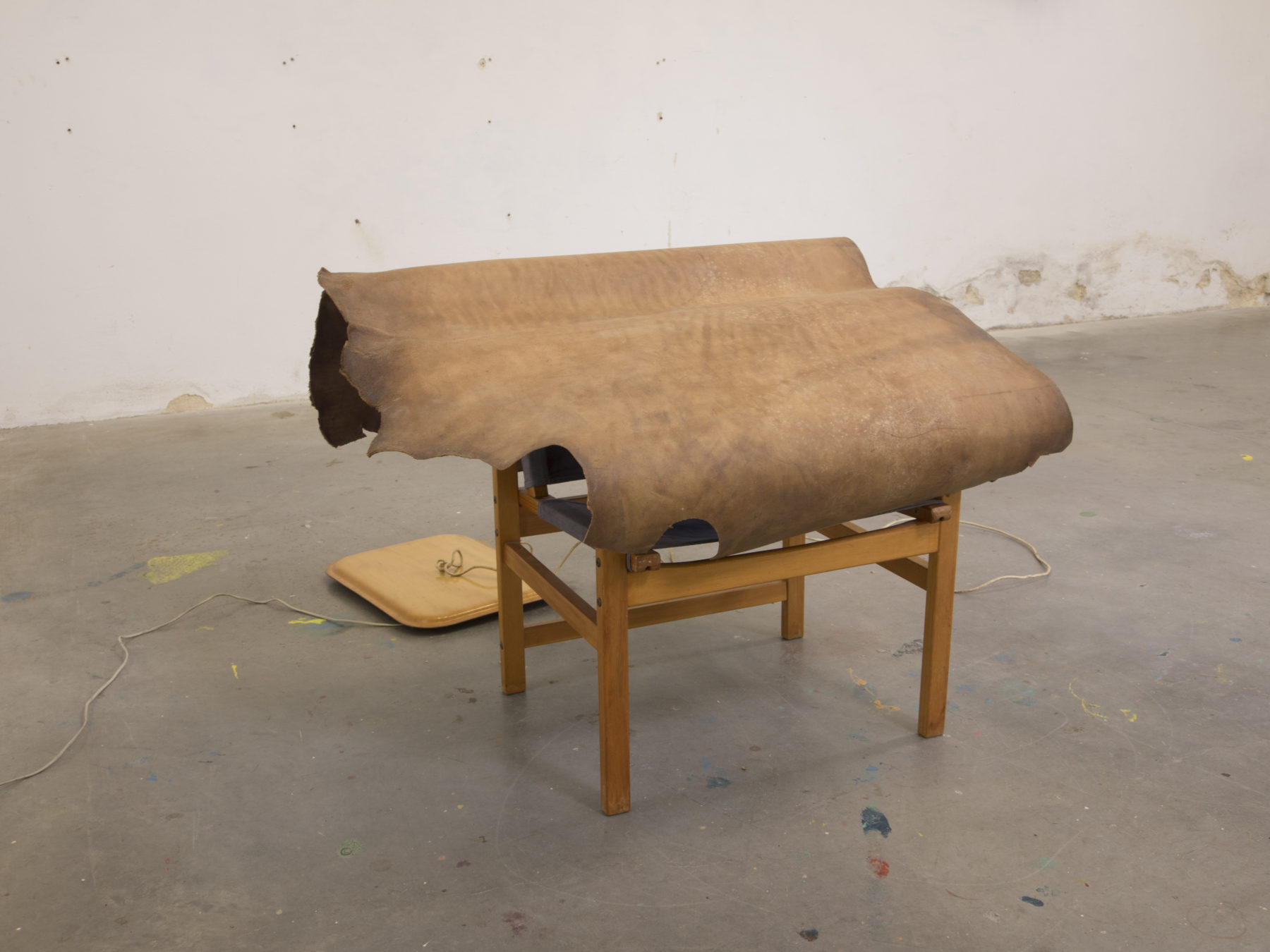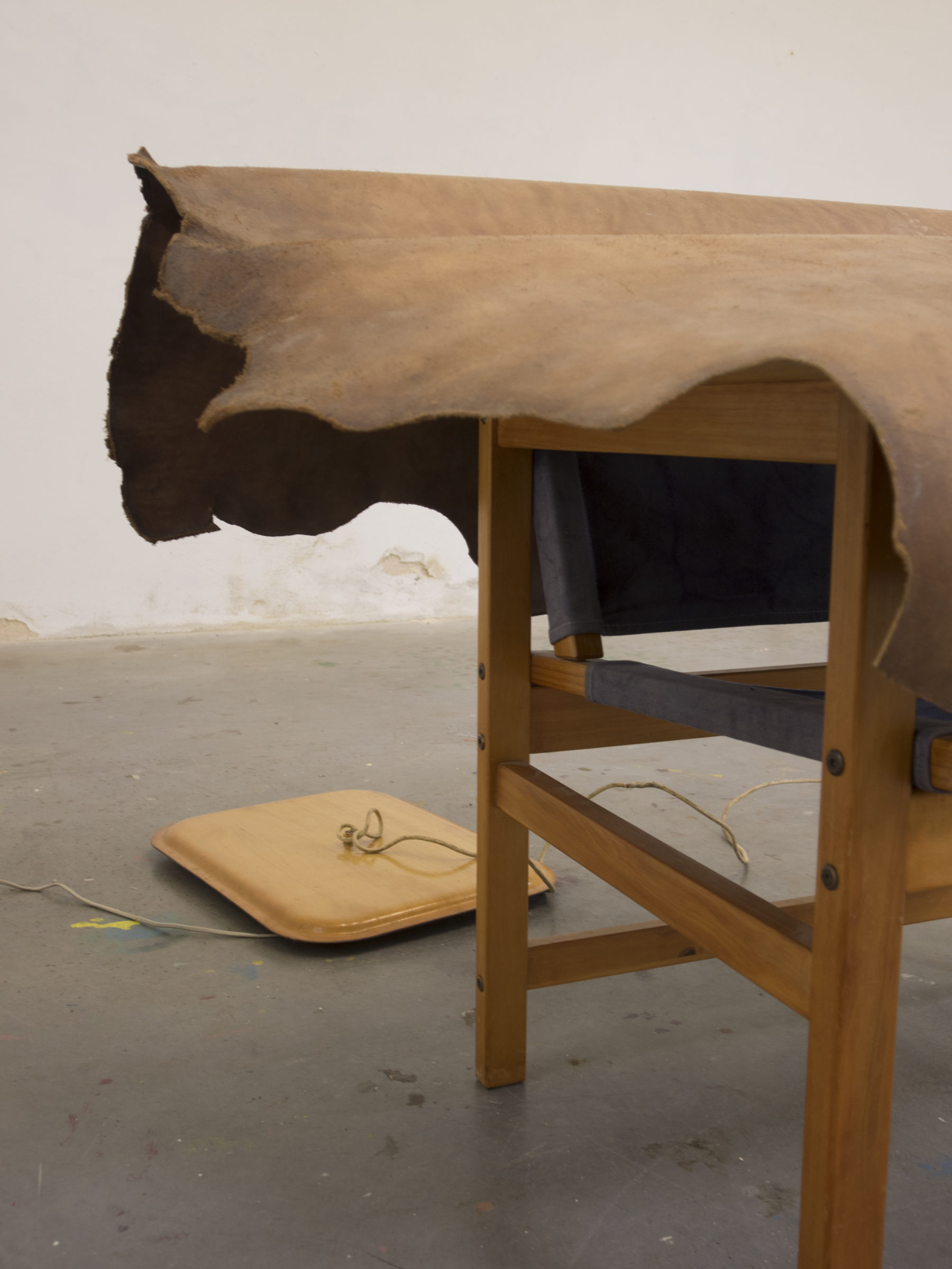 chaise, cuir, plateau repas retourné, moteur, câble téléphonique, maintenance, chaussures en cuir découpées